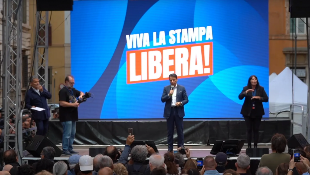 “La politica deve essere responsabile, le istituzioni devono fare in modo che i giornalisti possano svolgere il loro lavoro”. Dalla piazza convocata dal Movimento 5 stelle — ma senza bandiere — per la stampa libera e in solidarietà di Sigfrido Ranucci, il primo a parlare è il presidente pentastellato Giuseppe Conte. Che da piazza Santi Apostoli lancia un appello al governo: “Il partito della presidente del Consiglio dovrebbe ritirare la querela a Ranucci, e così i ministri. Da presidente del Consiglio, anche davanti agli articoli più pesanti, non ho mai querelato”.