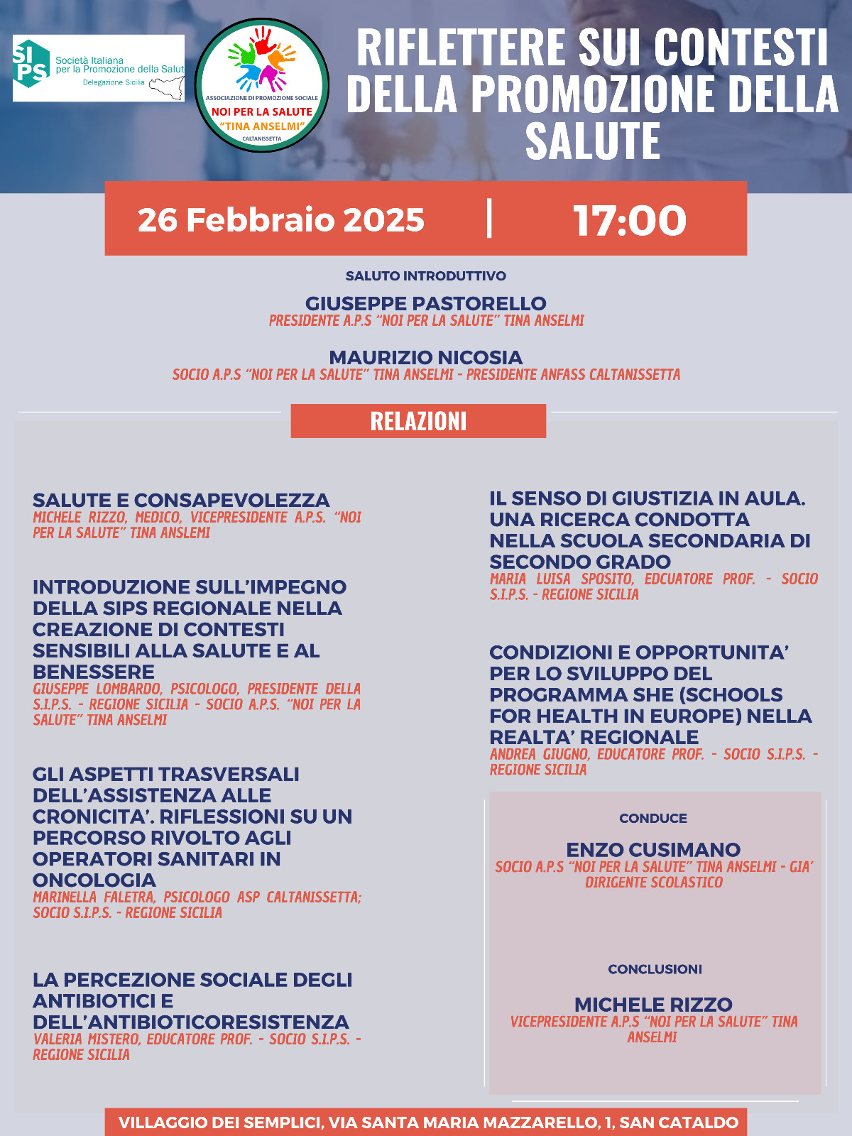“La Società Italiana per la Promozione della Salute (SIPS) – Delegazione della Regione Sicilia e l’Associazione di Promozione Sociale “Noi per la Salute – Tina Anselmi” di Caltanissetta hanno organizzato un convegno sul tema “Riflettere sui contesti della Promozione della Salute” con il quale si intende proporre ad un pubblico non solo di addetti ai lavori l’esigenza di investire sui contesti che a vario titolo riguardano la promozione della salute e del benessere, come la scuola o i servizi sanitari.