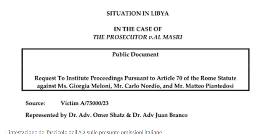 La comunicazione legale raccolta dall’Ufficio del procuratore si compone di 23 pagine nelle quali è ricostruita la vicenda Almasri fino alla riconsegna in Libia. La firma è di “Front-Lex” una organizzazione internazionale di avvocati per i diritti umani che danni è in prima linea davanti ai tribunali dell’Ue, dell’Onu e dell’Aja. Il rifugiato è assistito a Parigi da due avvocati impegnati in svariati processi davanti alle giurisdizioni internazionali: Juan Branco e Omer Shatz.