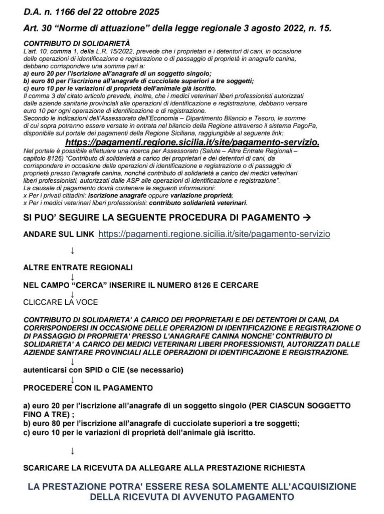 Apprendo con sconcerto che, a partire dal 22 ottobre 2025, la Regione Siciliana ha reso obbligatorio un pagamento – chiamato “Contributo di Solidarietà” – per chiunque debba iscrivere un cane all’anagrafe canina, effettuare un passaggio di proprietà o persino per i veterinari che registrano microchip.
