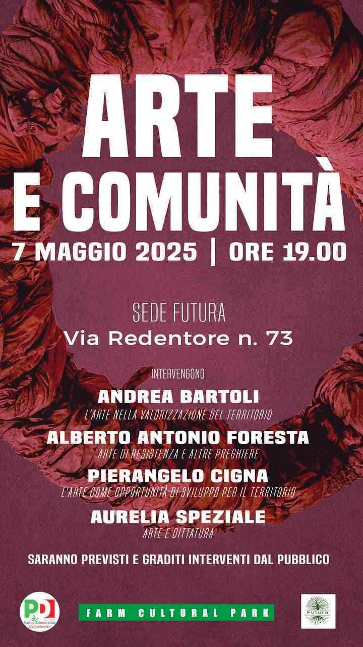 Il 7 maggio 2025 alle ore 19.00, presso la sede di “Futura – Costruiamo insieme la Città” in Via Redentore n. 73 a Caltanissetta, si terrà l’incontro “Arte e Comunità”. In un’epoca in cui il senso di appartenenza e il valore culturale dei territori sono messi alla prova, l’arte si rivela un potente strumento di resistenza e sviluppo. Per questo, “Futura – costruiamo insieme la Città” e il Partito Democratico hanno voluto riunire voci autorevoli, capaci di raccontare come la creatività possa diventare un motore di cambiamento della nostra comunità di Caltanissetta.Interverranno: Andrea Bartoli che tratterà il tema dell’arte nella valorizzazione del territorio, Alberto Antonio Foresta che parlerà dell’arte di resistenza e altre preghiere, Pierangelo Cigna dell’arte come opportunità di sviluppo per il territorio e Aurelia Speziale su arte e dittatura.Sarà un’occasione per riflettere insieme sul significato profondo dell’arte come linguaggio collettivo, spazio di libertà e leva di trasformazione sociale. Saranno previsti e graditi interventi dal pubblico.Paola SanfilippoPortavoce “Futura – costruiamo insieme la città”