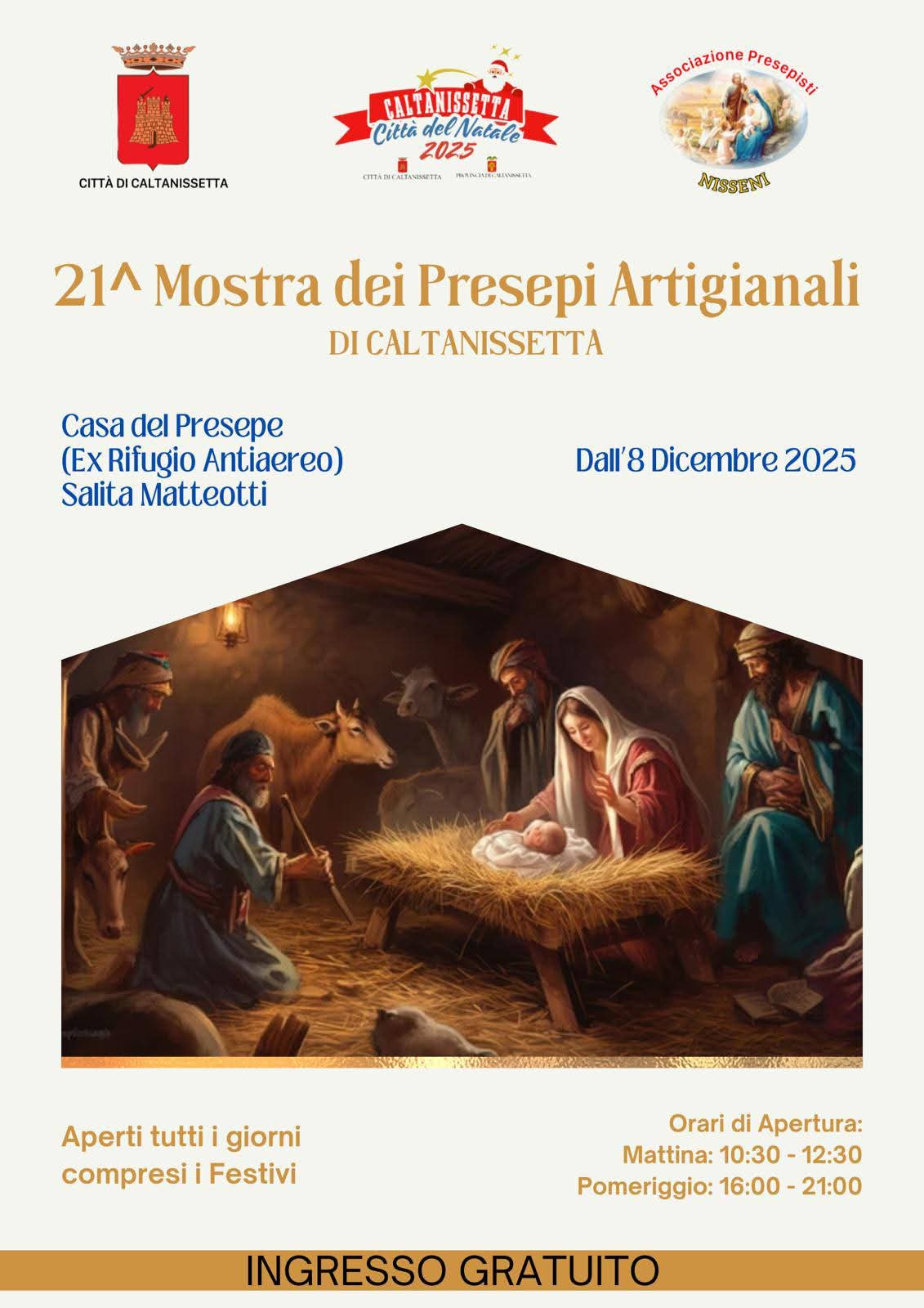 Lunedì 8 Dicembre l’ Associazione Presepisti Nisseni Patrocinata dal Comune di Caltanissetta alle ore 18:45 presso la Casa del Presepe nella Salita Matteotti darà vita alla cerimonia di inaugurazione della 21 Mostra dei Presepi Artigianali e della 2 Mostra di Pittura ” Dipingi il Tuo Natale”.