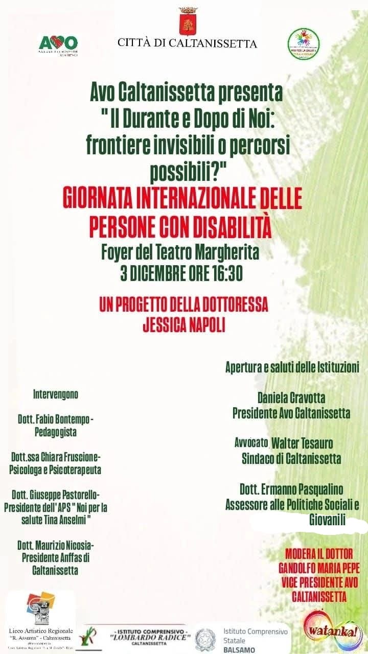 L’AVO Caltanissetta, con il Patrocinio del Comune di Caltanissetta ed il supporto dell’ Assessorato alle Politiche Sociali e Socio Sanitarie e dell’Assessore al ramo, Ermanno Pasqualino, ed anche alla collaborazione con l’APS ” Noi per la salute Tina Anselmi “, invita a discuterne in occasione della Giornata Internazionale delle Persone con Disabilità alla conferenza “Il Durante e Dopo di Noi: frontiere invisibili o percorsi possibili?”
