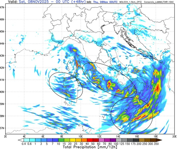 La mappa qui sotto mostra proprio le notevoli cumulate di pioggia previste, con tutte le zone a rischio, anche idro-geologico (pericolo di alluvioni e frane): l’insidia maggiore con queste configurazioni è determinata dal fatto che sistemi temporaleschi di questo tipo potrebbero insistere anche per parecchie ore sulle medesime zone.