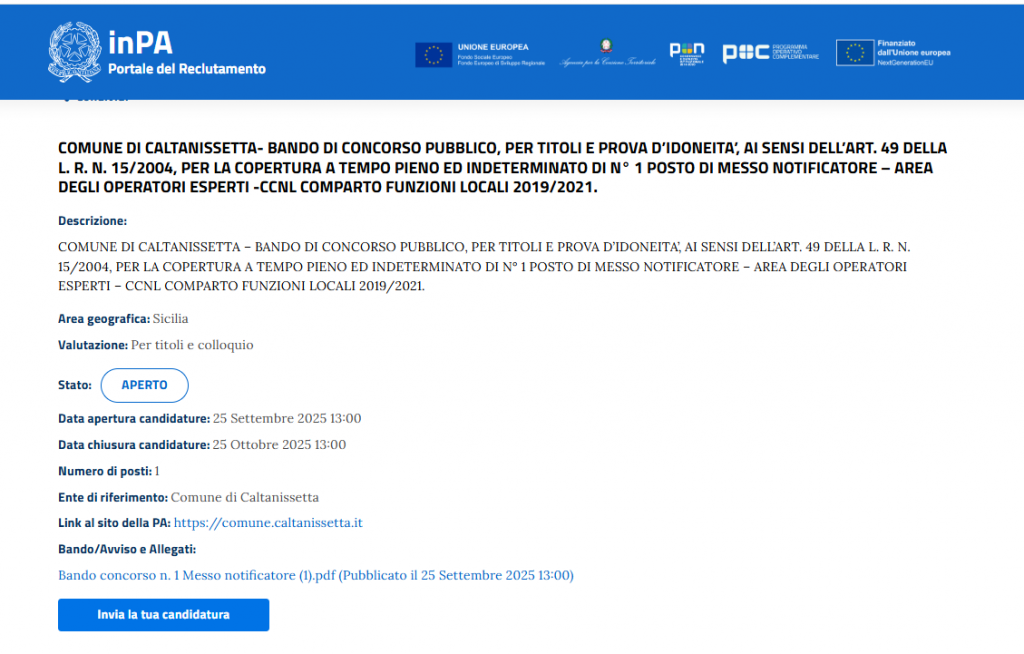 Al Comune di Caltanissetta rifatto il bando per il concorso pubblico per titoli e prova di idoneità per un posto di messo notificatore a tempo pieno e indeterminato.