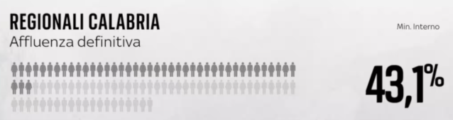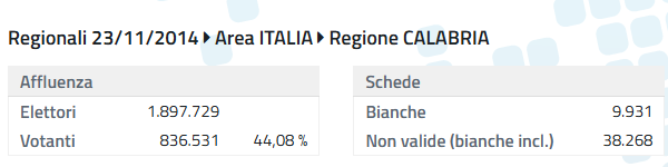 Le vergogne calabresi, che ovviamente hanno un grande risalto mediatico, fanno crollare la percentuale dei votanti nel 2014 quando Mario Oliverio vince per la coalizione di centrosinistra contro Wanda Ferro. Pensate che dal 59,27% l’affluenza crolla in maniera verticale al 44%: si parla di un clamoroso -15%…