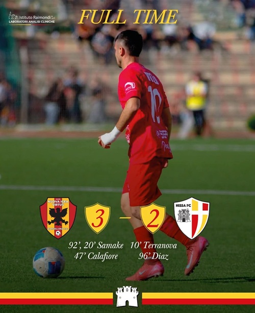 In avvio la Nuova Igea entra con il giusto approccio in campo, ma al 10′ passa la Nissa da cross dalla destra la testa di Terranova, lasciato solo in area, con la palla che si infila all’incrocio.