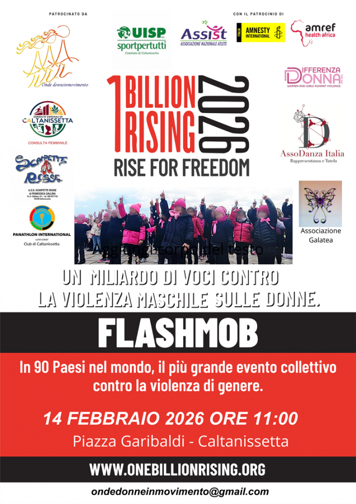 Reading: Caltanissetta: 14 febbraio “ONE BILLION RISING 2026” Flash mob contro la violenza maschile sulle donne. 14 febbraio 2026 , ore 11.00, Piazza Garibaldi. Locandina