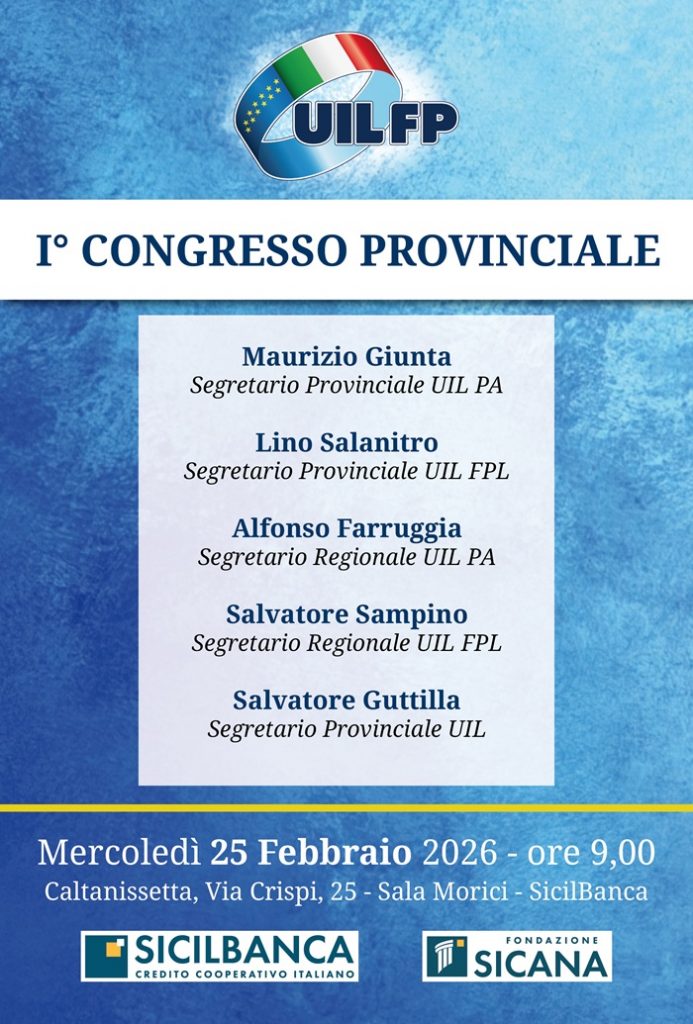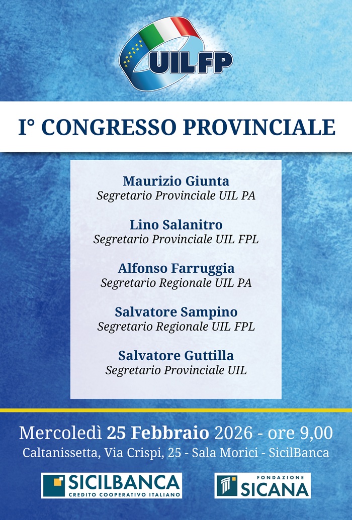 Il prossimo mercoledì 25 febbraio alle ore 9,00 a Caltanissetta, presso la Sala Conferenze “Morici” della Sicilbanca-Fondazione Sicana di via Crispi, si svolgerà il primo Congresso Provinciale del Consiglio Unificato delle Strutture Territoriali della UIL Federazione Poteri Locali ( UIL FPL ) e della UIL Pubblica Amministrazione (UILPA) al fine di dar vita alla UIL Funzione Pubblica che costituirà un nuovo organismo che unirà in sé le Categorie del Pubblico Impiego ( Funzioni Centrali, Enti Locali, Sanità e Terzo Settore ).