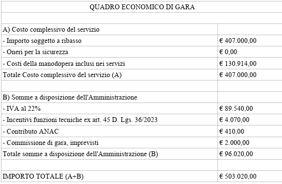 • la durata del contratto è fissata in anni uno; • La stazione appaltante si riserva, a suo insindacabile giudizio, di affidare il servizio per ulteriori anni uno, alle medesime condizioni economiche e contrattuali, con un preavviso da inviare all’Aggiudicatario 90 giorni prima della scadenza; • l’importo stimato dell’appalto è pari ad euro 407.000,00 oltre IVA;