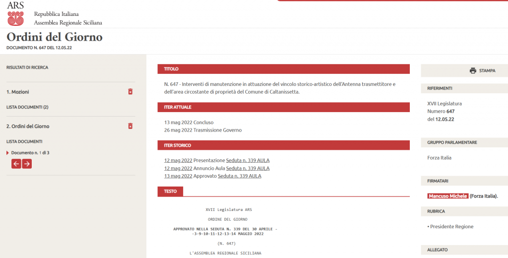 Stando alla lettura del Documento n.647 del 12.05.2022, XVII Legislatura ARS ORDINE DEL GIORNO APPROVATO NELLA SEDUTA N. 339 DEL 30 APRILE – -3-9-10-11-12-13-14 MAGGIO 2022, allegata sotto, dal titolo: Interventi di manutenzione in attuazione del vincolo storico-artistico dell’Antennatrasmettitore e dell’area circostante di proprietà del Comune di Caltanissetta, effettivamente si legge che l’Antenna è di proprietà del Comune di Caltanissetta.