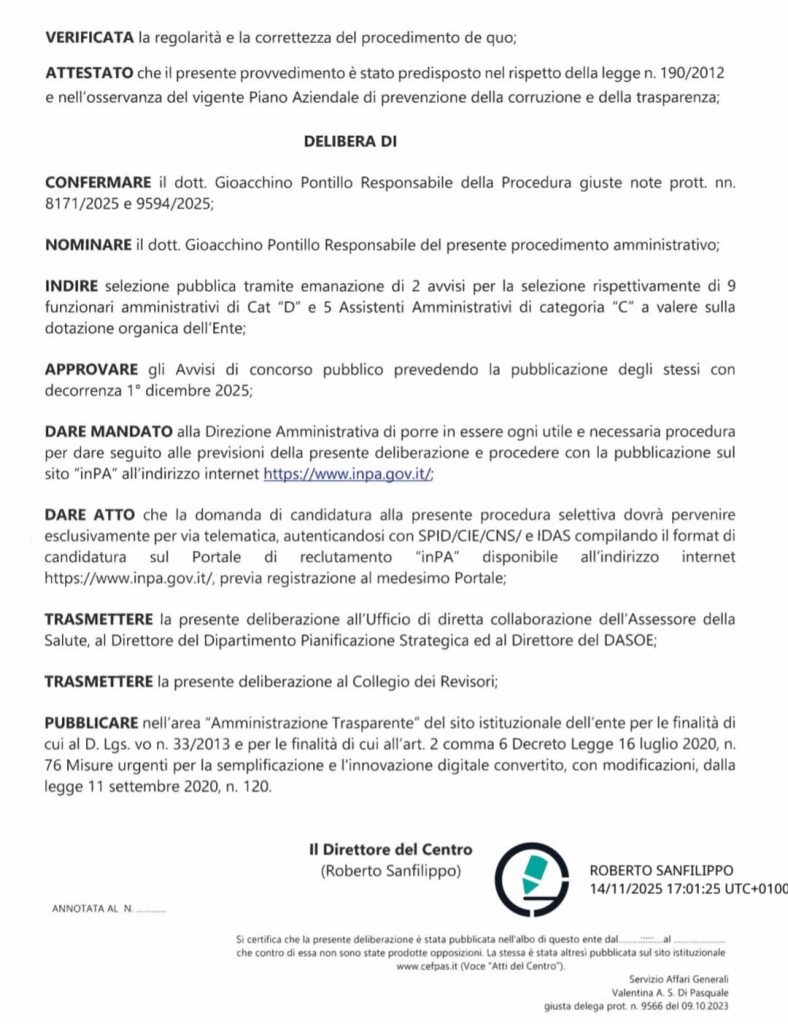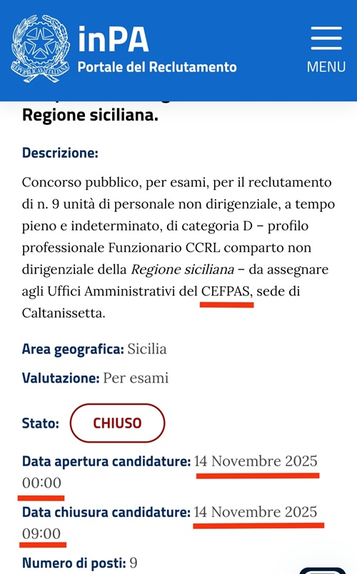 Ho appreso che nella giornata del 14 novembre 2025, il CEFPAS di Caltanissetta ha aperto le candidature per un concorso pubblico, per esami, per l’assunzione, a tempo pieno e indeterminato, di n. 9 unità di personale di categoria D, profilo professionale Funzionario. CCRL comparto non dirigenziale della Regione siciliana.