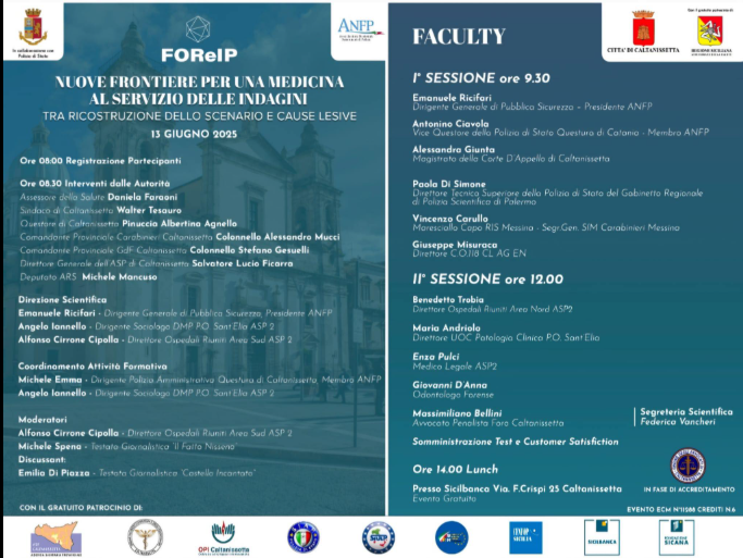 Venerdì 13 giugno, presso la Sala Convegni di Sicilbanca a Caltanissetta, si terrà il convegno formativo “Nuova frontiere della medicina al servizio delle indagini. Dalla ricostruzione dello scenario alle cause lesive” , organizzato dall’Associazione FOReIP con il patrocinio dell’Assessorato della Salute e dell’Asp di Caltanissetta.