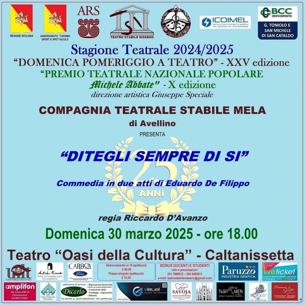 La Compagnia che si esibirà per quello che è già sold out, sarà la Compagnia Teatrale Stabile “Mela” di Avellino, con la commedia in due atti “Ditegli sempre di si” di Eduardo De Filippo, per la regia di Riccardo D’Avanzo.