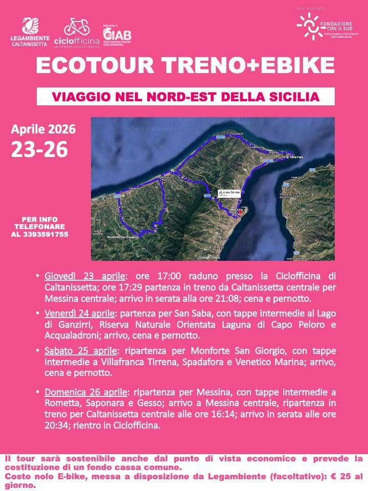 È questo lo spirito dell’“Ecotour Treno + E-bike dei Peloritani – Giro in E-bike della Sicilia nord-orientale”, in programma dal 23 al 26 aprile 2026. L’iniziativa rientra tra le azioni di “Cicli solidali”, progetto sostenuto dalla Fondazione Con il Sud e finalizzato a promuovere l’utilizzo di mezzi a pedalata assistita e servizi di prossimità a basso impatto ambientale nei territori di Enna, Caltanissetta e nei comuni limitrofi.