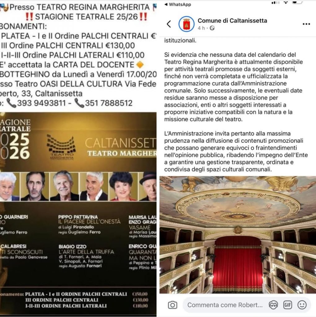 “Un giorno dopo il consiglio comunale monotematico sui beni culturali, l’ennesima perla “malafiura” sul teatro. Esce una locandina sulla prima stagione teatrale dell’amministrazione Tesauro, ma viene prontamente smentita. Dopo la mancata nomina del direttore artistico, la mancata stagione teatrale 24-25, adesso questo episodio davvero non commentabile. Sulla cultura nissena succedono cose inenarrabili accompagnate da un silenzio tombale. Dopo un anno dall’insediamento dovrebbero iniziare ad occuparsi di cultura e non di feste di paese profumatamente finanziate dalle “mancette elettorali” dei loro danti causa e feudatari regionali. Il mondo della cultura nissena è completante abbandonato dall’amministrazione Tesauro che può soltanto vergognarsi per quello che sta succedendo.