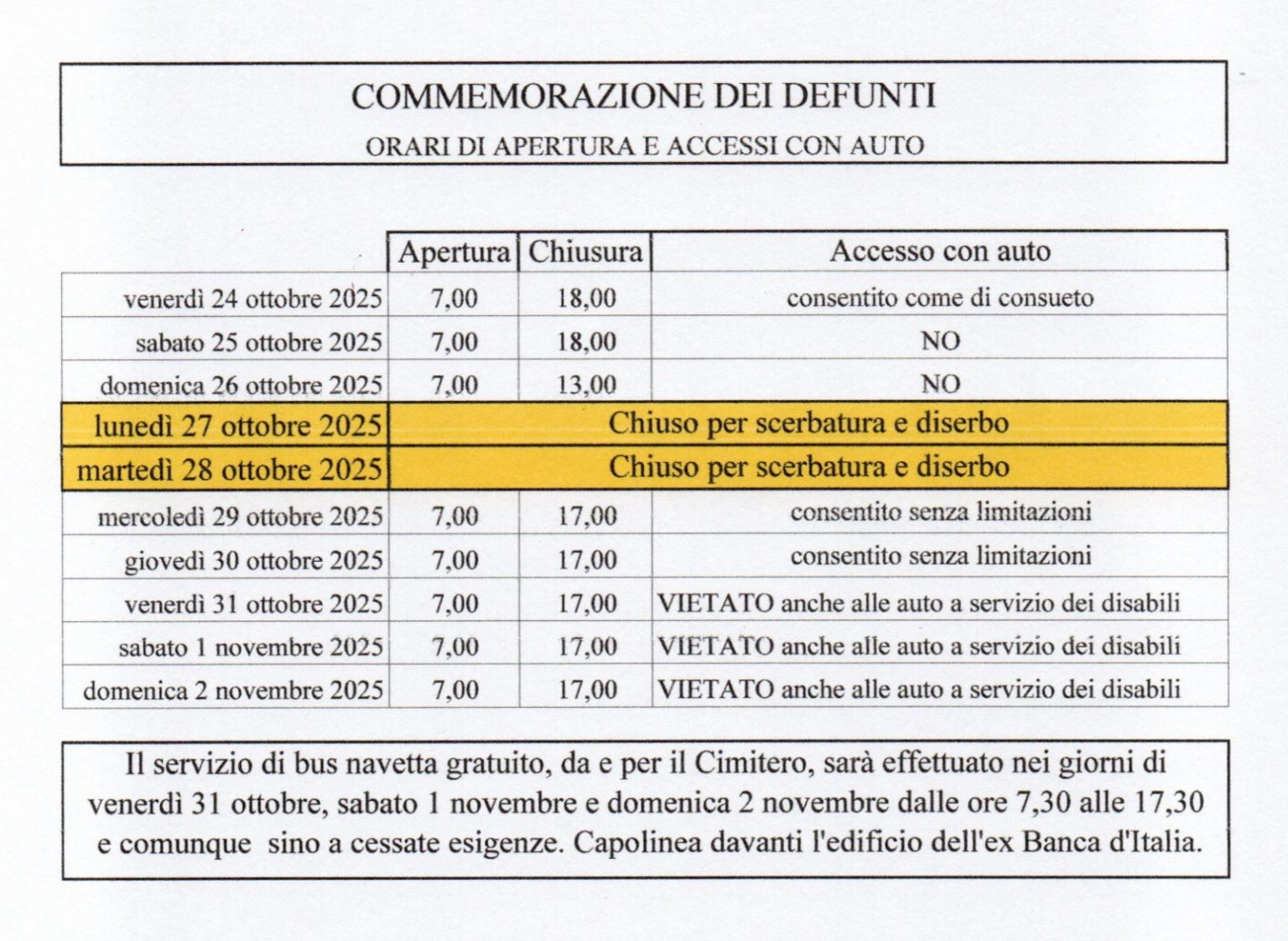 Riceviamo rettifica, su quanto precedentemente pubblicato sugli orari di apertura del cimitero per domenica 26 ottobre.