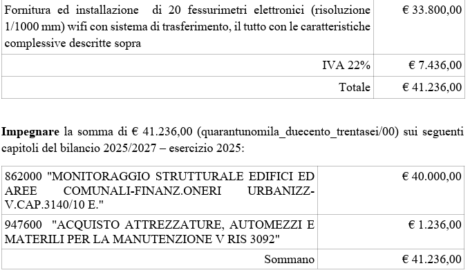 Con note prot. n. 727 del 5/1/2025 e n. 733 del 6/1/2025 questo Comune ha chiesto a due ditte specializzate. un preventivo per la fornitura e collocazione dei seguenti dispositivi; 20 (venti) fessurimetri elettronici (risoluzione 1/1000 mm) wifi con sistema di trasferimento dati su cloud consultabili live e allarme su cellulare al superamento di valori soglia.