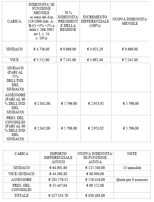 A questo dato, seppur parziale ma che può far stimare la spesa per il 2025 solo per il cosniglio, vicino a 350.000,00, vanno aggiunti gli emolumenti di sindaco e assessori che, dopo il doppio adeguamento, risultano essere di 838.488,00€, portando il totale vicino a 1.200.00,00€: