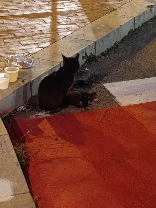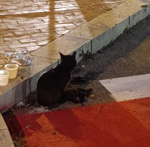 Nella foto, un gatto che veglia sul corpicino di un suo simile morto investito, in via Rochester”.