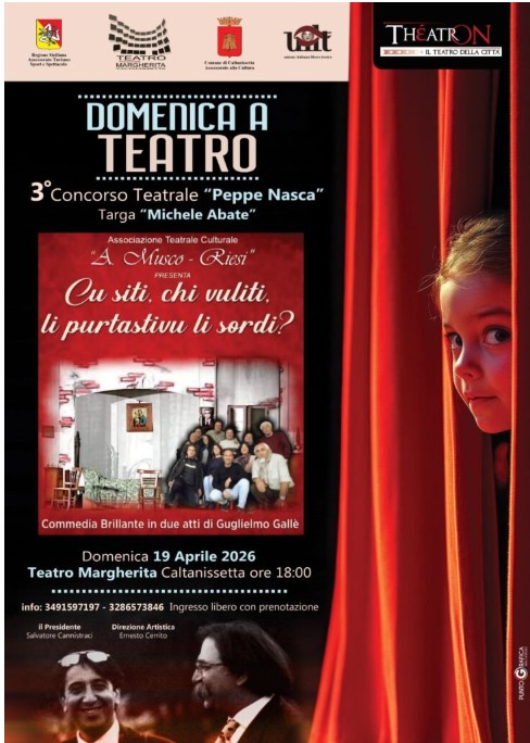 Al Teatro Regina Margherita di Caltanissetta continua con successo e grande partecipazione di pubblico il 3° Concorso Teatrale “Peppe Nasca” – Targa “Michele Abate”, confermandosi come uno degli appuntamenti più significativi per il teatro amatoriale siciliano e per la valorizzazione delle tradizioni popolari. Rassegna organizzata dalla compagnia Thèatron, con la Direzione Artistica di Ernesto Cerrito e del Presidente Totò Cannistraci.