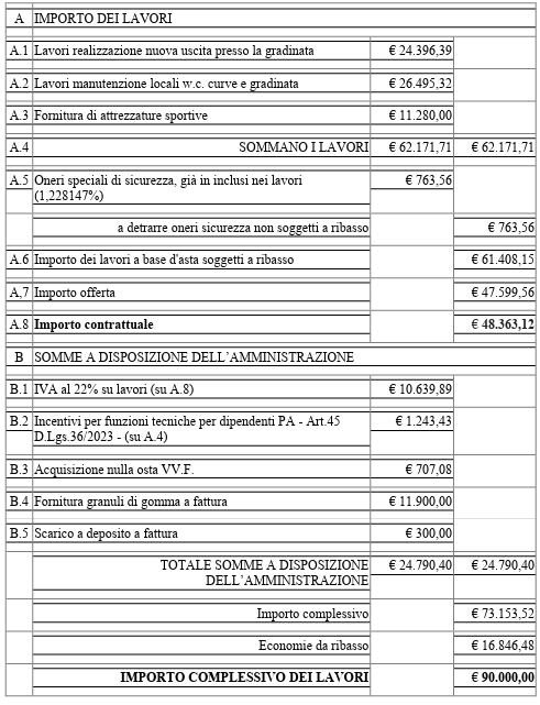 Nelle more della stipula del contratto d’appalto con l’impresa aggiudicataria veniva effettuata la consegna dei lavori per motivi di urgenza in data 17/02/2025 consegna ai sensi dell’art. 50 comma 6 del D.Lgs. n° 36/2023; Visto la lettera di contratto n° 22 del 06/03/2025. Che durante l’esecuzione dei lavori con verbale del 24/02/2025 sono stati concordati nuovi prezzi non presenti nel prezziario della Regione Siciliana relativi a lavori urgenti non previsti in progetto. Che in data 21/03/2025 è stato emesso il certificato di pagamento n° 1.; Che in data 01/07/2025 è stato emesso il certificato di pagamento n° 2; Che durante l’esecuzione dei lavori si è reso necessario eseguire interventi urgenti di messa in sicurezza degli impianti sportivi comunali per garantire la loro funzionalità durante lo svolgimento delle attività sportive: – Lavori di rifacimento della scala di accesso ai locali spogliatoi di atletica dalla quale si verificavano infiltrazione nel sottostante locale quadri elettrici; – Sostituzione porte in legno nei locali spogliatoi con l’utilizzo di porte dismesse dai locli w.c. della gradinata; – Lavori di manutenzione del locale spogliatoio arbitro con collocazione di piastrelle e rifacimento porzioni di intonaco; – Lavori di sistemazione del tunnel di collegamento tra i locali spogliatoi ed il campo.