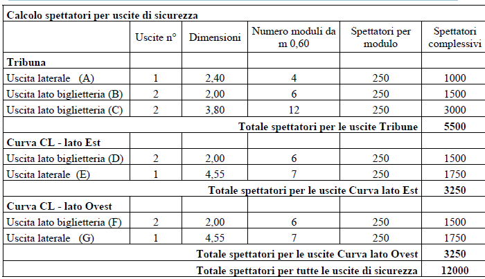 1. che le uscite di sicurezza dei vari settori consentono una capacità di deflusso degli spettatori superiore al numero di spettatori individuati dalla C.P.V.L.P.S., come risulta dalla seguente tabella di analisi: