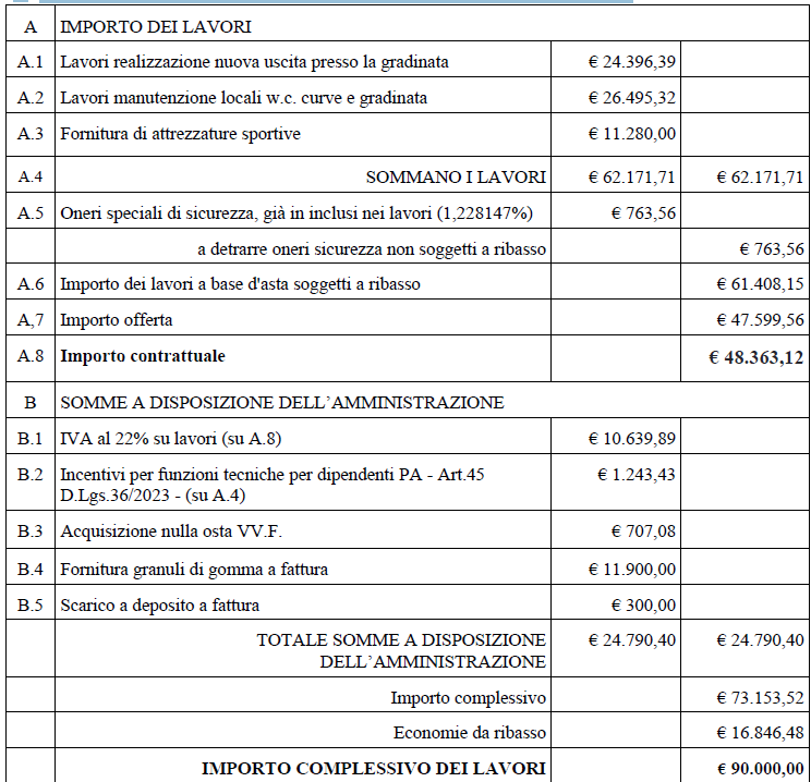 • con Deliberazione della Giunta Comunale n° 153 del 13/12/2024 è stato approvato il progetto esecutivo dei “Lavori di adeguamento dell’impianto sportivo M. Tomaselli per l’aumento del numero di spettatori tramite utilizzo della gradinata centrale”