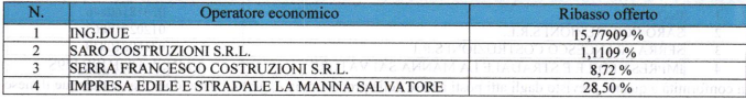 Dall’esito dell’esame degli stessi, si prende atto che il ribasso del 28,50 % sull’importo di € 25.350,00, oltre € 650,00 per oneri per la sicurezza , offerto dall’ lmpresa Edile e Stradale La Manna Salvatore con sede legale in Caltanissetta, via Padre Pio Da Pietrelcina, n. 20, C. F. : LMNSVT80HI9B429S e Partita M: 0l8l1670858, è da ritenersi congruo, tenuto conto dei ribassi per tale tipologia di lavori.