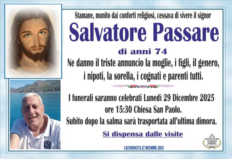 I funerali saranno celebrati lunedì 29 dicembre alle ore 15:30 nella Chiesa di San Paolo.