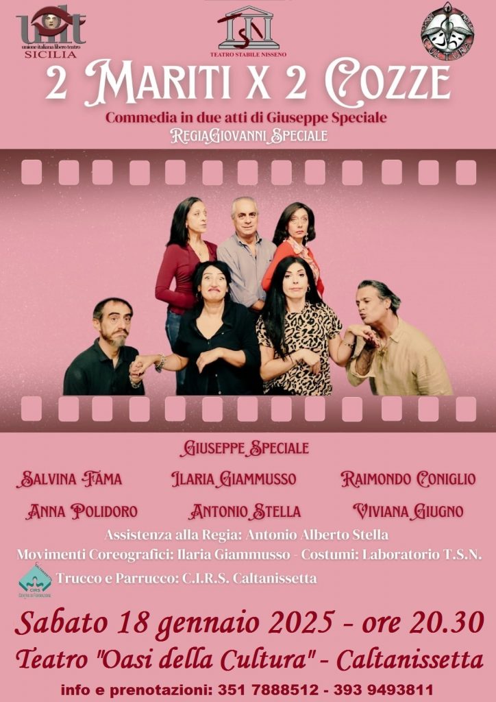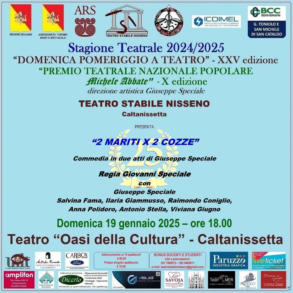 Per il quinto appuntamento della XXV edizione della Stagione Teatrale “Domenica Pomeriggio a Teatro” e, fuori concorso, per la X edizione del Premio Teatrale Nazionale Popolare “Michele Abbate”, sabato 18 gennaio 2025 alle ore 20.30 e domenica 19 gennaio 2025, alle ore 18.00 sarà di scena il Teatro Stabile Nisseno con la nuova commedia “2 Mariti X 2 Cozze”, commedia comica in 2 atti di Giuseppe Speciale con la regia Giovanni Speciale
