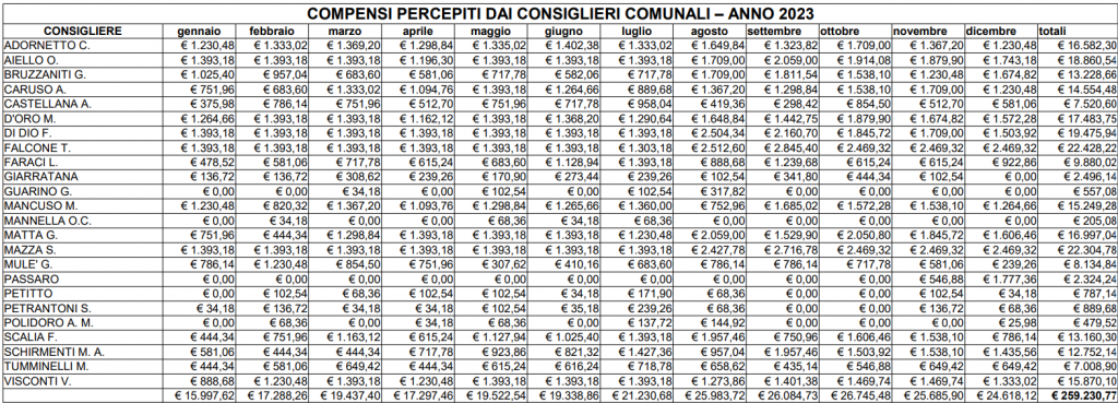 Da quel momento in poi potranno essere loro retribuite un massimo di 100 presenze e comunque, anche se superate, non potranno andare oltre il limite di 1/3 dello stipendio del sindaco, nel 2023 alcuni infatti raggiunsero la somma di € 2.469,32, come si evince dalla tabella.