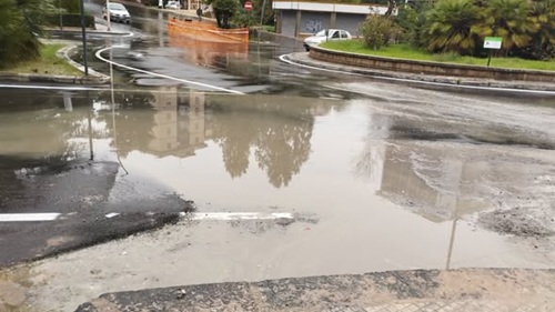 Caltanissetta: Rotatoria via Turati allagata. La strada è stata asfaltata da poco