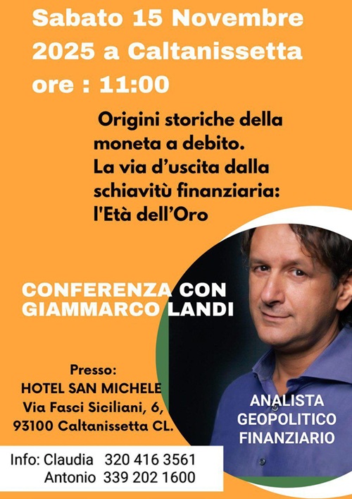 Sabato 15 novembre 2025, alle ore 11,00, presso la sala Borsellino dell’hotel San Michele di Caltanissetta, avrà luogo la conferenza del noto economista Gianmarco Landi dal titolo “Origini storiche della moneta a debito. La via d’uscita dalla schiavitù finanziaria: l’Età dell’Oro “.