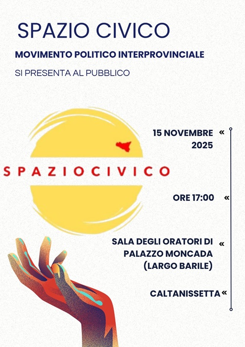 Sabato 15 novembre, dalle 17:00 alle 19:00, nella Sala degli Oratori di Palazzo Moncada a Caltanissetta, si terrà la presentazione ufficiale di “Spazio Civico”, una nuova rete provinciale che riunisce movimenti e realtà politiche consolidate dei territori di Caltanissetta, Gela, Mazzarino, San Cataldo, Delia, Sommatino e Santa Caterina.