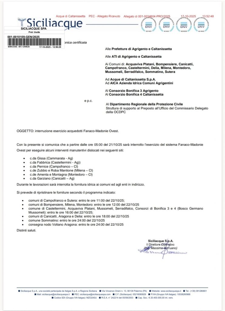 La sospensione del servizio interesserà 6 Comuni della provincia di Enna (Gagliano Castelferrato, Agira, Enna, Piazza Armerina, Valguarnera Caropepe e Aidone) e 3 del Nisseno (Caltanissetta, San Cataldo e Mazzarino), più i Consorzi di Bonifica 4 e 6.