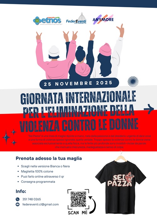 L’iniziativa organizzata da FederEventi Caltanissetta, Anymore in collaborazione con la Cooperativa Etnos. “Sei Pazza” annuncia il lancio di una linea di magliette dipinte a mano, che si presenta al pubblico in occasione della Giornata Internazionale per l’eliminazione della violenza contro le donne, il 25 novembre. Queste maglie sono più di un semplice capo d’abbigliamento: sono un manifesto contro la violenza verbale, un gesto di ribellione e di solidarietà.