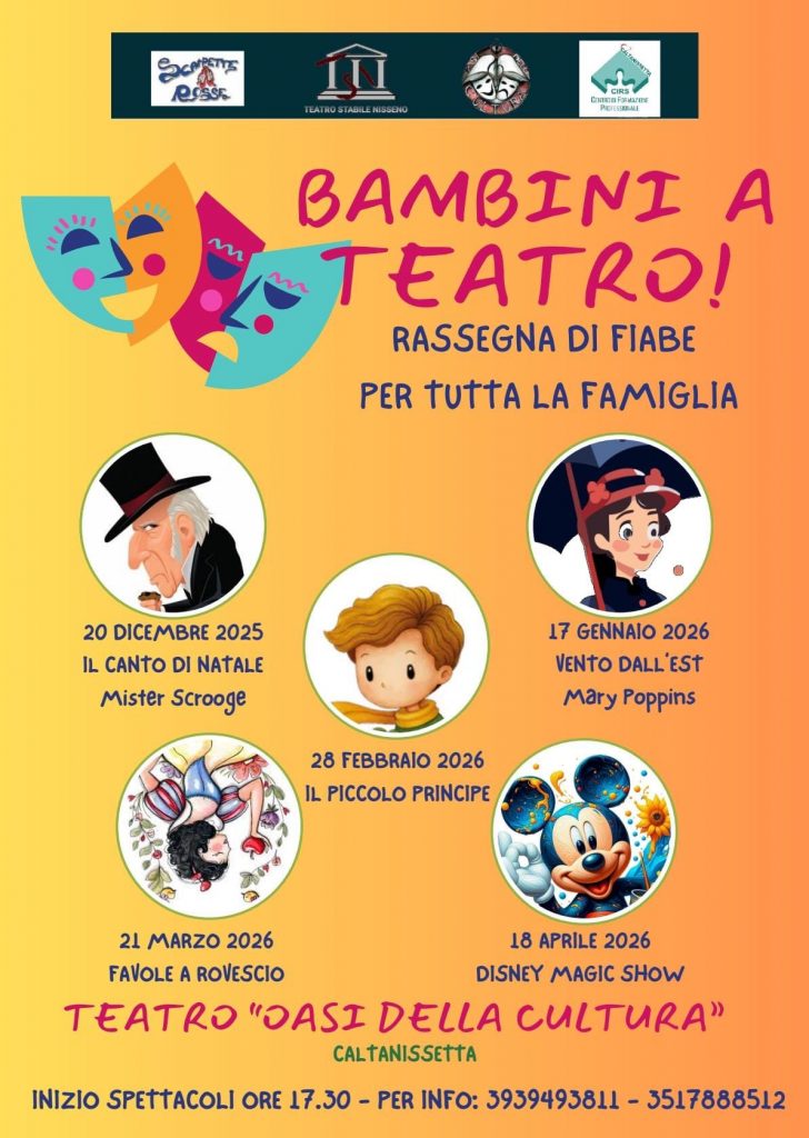 Il Teatro Stabile Nisseno rinnova il suo impegno verso la cultura e le nuove generazioni aprendo Sabato 20 Dicembre alle ore 17,30 al Teatro Oasi della Cultura ufficialmente la Rassegna Teatrale di Fiabe “Bambini a Teatro. Un percorso pensato per educare, emozionare e avvicinare i più piccoli al mondo del teatro attraverso spettacoli di alta qualità artistica e dal forte valore formativo.
