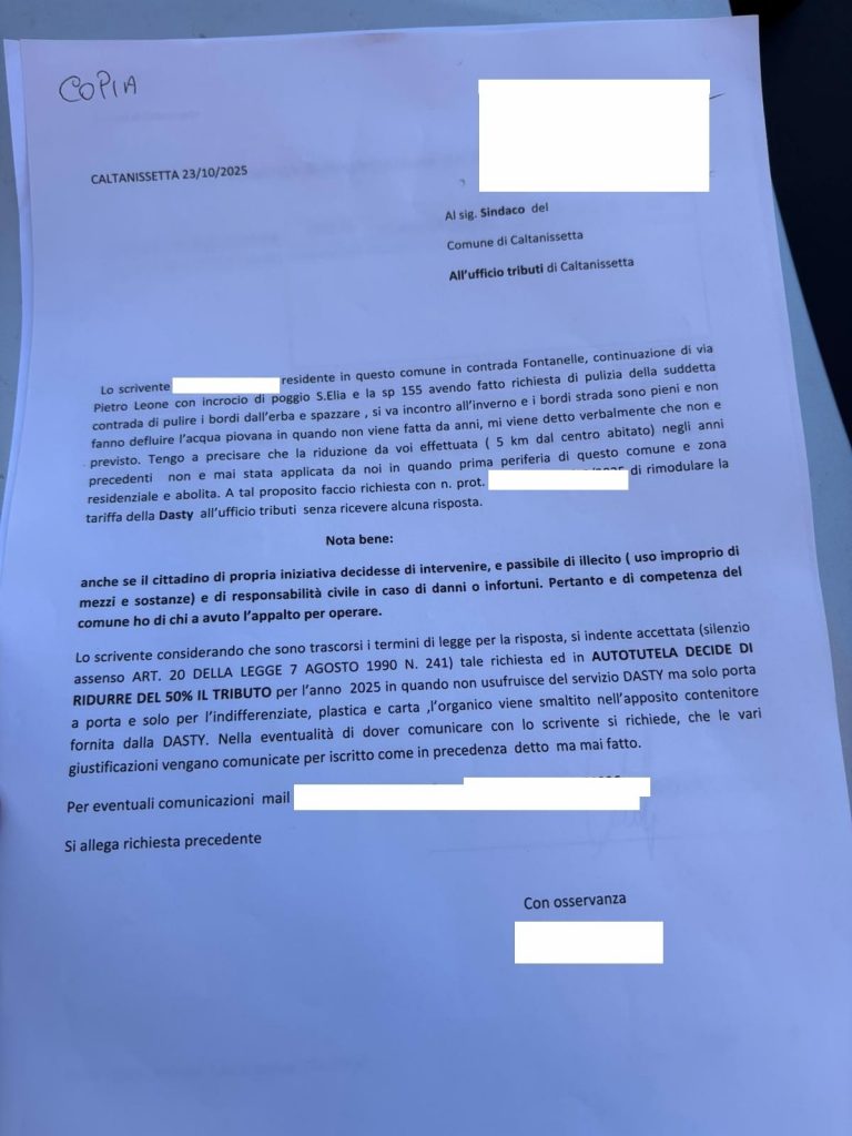 Aggiunge che dopo aver richiesto di rimodulare la tariffa, comunica al Sindaco e all’Ufficio Tributi che si riduce in autotutela il tributo della TARI del 50% per l’anno 2025, in quanto non usufruisce del servizio Dusty ma solo porta a porta e solo per l’indifferenziata, plastica e carta, plastica e carta, l’organico viene smaltito nell’apposito contenitore fornito dalla Dusty, e non avendo ricevuto risposta entro i termini di legge, la richiesta di riduzione si intende accettata (silenzio assenso ART.20 della legge 7 Agosto 1990 n.241).
