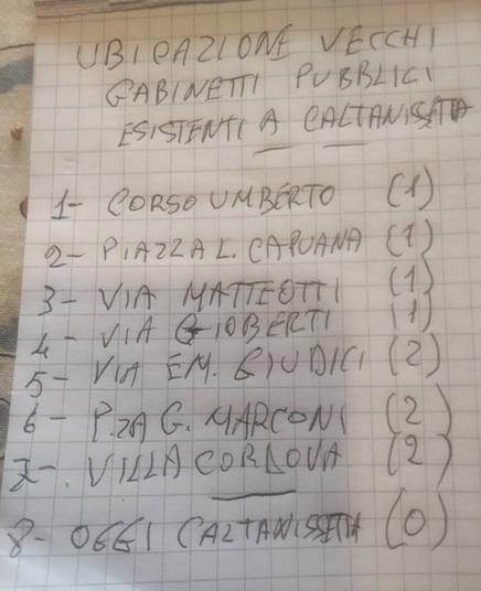 Caltanissetta, guardando quello che succede anche in altre città, dovrebbe avere dei bagni pubblici fissi, distribuiti nei punti di maggior affluenza, centro storico e ville, servizi igienici accessibili ovviamente anche a persone con disabilità.