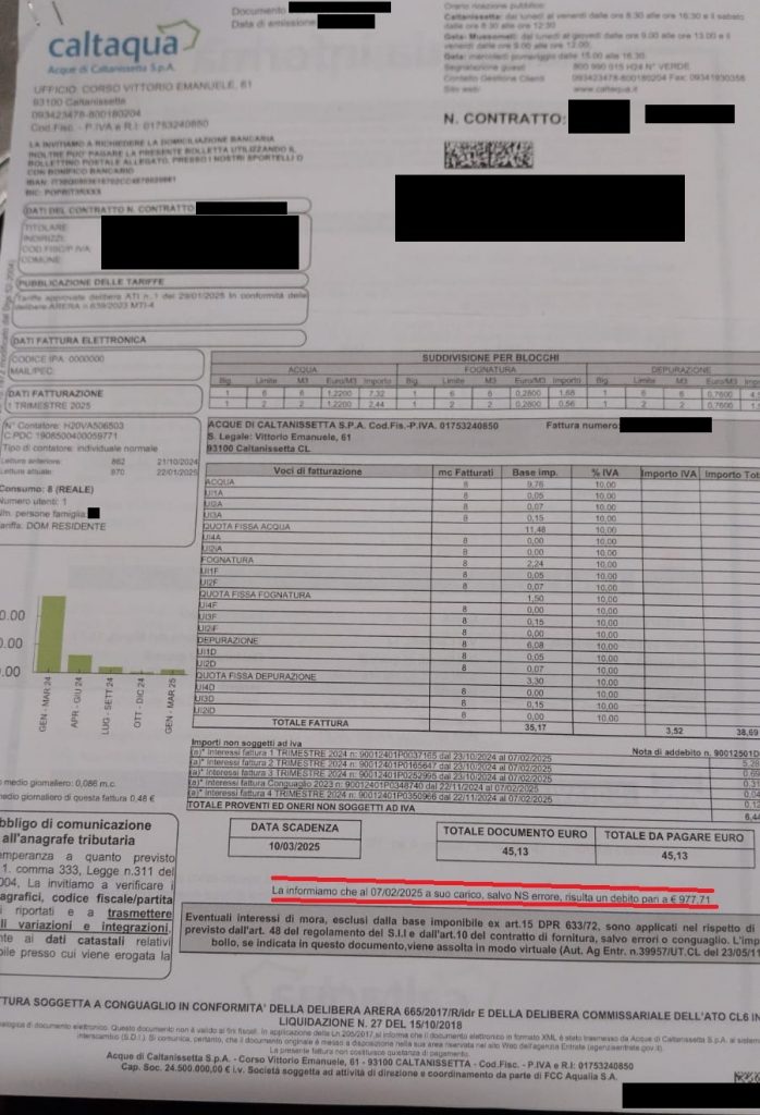 Stamattina, dopo parecchie settimane che non ricevevo acqua corrente, non me ne accorgo avendo ampie riserve dalle quali mi approvvigiono, sono rimasta a secco. Dopo essermi informata con i vicini, pensando fosse l’ennesimo ritardo, avendo ricevuto rassicurazioni che l’acqua arrivava quasi regolarmente, ho a questo punto immediatamente chiamato il mio idraulico, pensando fosse un problema mio. Ma appena abbiamo aperto l’alloggiamento dove c’è il contatore di Caltaqua, ci siamo ressi conto che qualcosa non andava. Il mio attacco, adesso non so spiegarlo tecnicamente bene, risultava staccato, praticamente mi avevano tagliato l’acqua senza alcun preavviso. Nell’ultima bolletta pagata, che vi allego e che ho regolarmente pagato tramite CBILL, come da ricevuta, risultava un debito di 977,71 euro, che a breve mi accingevo a pagare andando magari prima a discuterne prima presso i loro uffici. Nella stessa bolletta però non si faceva alcun riferimento al fatto che, se non avessi provveduto a saldare il presunto debito immediatamente, mi sarebbe stata tagliata l’acqua, come invece è accaduto, anche perchè, se non mi sbaglio, prima di procedere alla sospensione della fornitura il gestore dovrebbe inviare il preavviso al cliente, magari tramite una raccomandata con gli estremi della bolletta da pagare e i modi per evitare la sospensione, cosa che a me non è successa. Raccontando quanto successo, ho appreso che non sono la sola “fortunata” a cui è stato riservato questo trattamento. Ritengo che questo modo di agire non sia molto corretto, almeno prima avvisare o intimare un termine, non si può staccare l’acqua a famiglie dove ci sono anziani, bambini e ammalati senza avvisare preventivamente. E’ chiaro che, pur non essendo una benestante, mi sarei pure tolta il pane dalla bocca, ma non sarei mai arrivata a farmi tagliare l’acqua. Amareggiata e offesa, questi sono i miei sentimenti al momento, lo sono ancor di più perchè stamattina mi son vista costretta a chiamare immediatamente un’autobotte, che provvederò a pagarmi, meditando nel frattempo, facendomi bene i calcoli, visto che con un consumo di 8 metricubi, mi arrivano 45,13 euro da pagare, se proprio mi conviene farmi riattivare il contatore o andare avanti con le autobotti pagando a loro soltanto il minimo indispensabile. Spero che quanto successo a me, ma pare anche ad altri, il signor sindaco ne venga a conoscenza, invitandolo a prendersi maggior cura dei cittadini, intervenendo con Caltaqua chiedendo almeno di avvisare prima di staccare al fornitura. Ma mi accorgo che come avvenuto anche per la TARI, questa pratica non viene rispettata, prima si bloccano, in questo caso i conti correnti, e poi si discute. Non mi pare una bella cosa. I cittadini non sono un bancomat, già pagano di tutto di più, spero anche che i consiglieri comunali leggano e intervengano per sollevare il caso, che pare riguardi anche altri cittadini. Grazie per l’accoglienza. Allego l’ultima bolletta dove si evince solo il presunto debito, ma che non vi è indicato alcun termine per il pagamento pena l’interruzione.