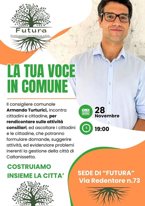 Caltanissetta:Torna “La tua voce in Comune”, il ciclo di incontri promosso dal gruppo politico “Futura – Costruiamo insieme la città”. Locandina