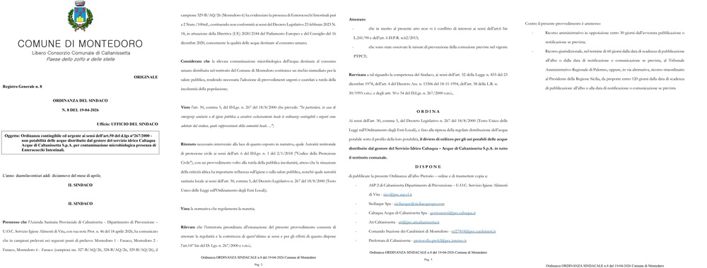 Comune di Montedoro Ordinanza sindacale n. 8 del 19/04/2026 Ordinanza contingibile ed urgente ai sensi dell’art.50 del d.lgs n°267/2000 – non potabilità delle acque distribuite dal gestore del servizio idrico Caltaqua Acque di Caltanissetta S.p.A. per contaminazione microbiologica presenza di Enterococchi Intestinali.