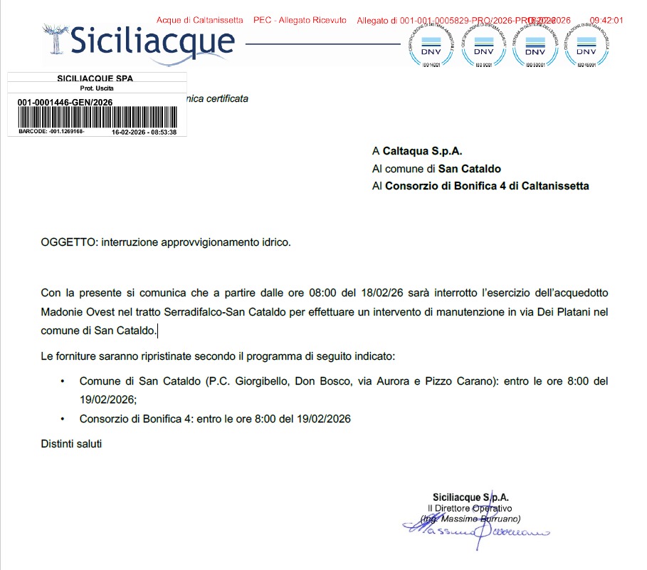Siciliacque comunica che a partire dalle ore 08:00 del 18/02/26 sarà interrotto l’esercizio dell’acquedotto Madonie Ovest nel tratto Serradifalco-San Cataldo per effettuare un intervento di manutenzione in via Dei Platani.