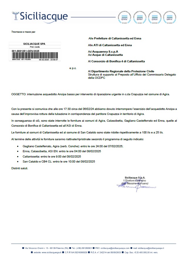 Caltanissetta 401 > News > Crisi idrica > Caltaqua informa: Comuni di Caltanissetta e San Cataldo. Interruzione dell’acquedotto Ancipa basso a causa di un intervento di riparazione urgente