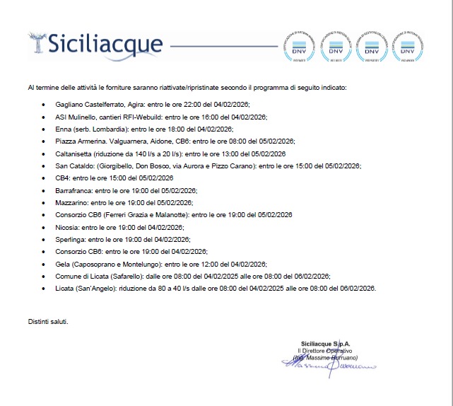 Ne consegue che dal 3/2 e fino a fine interventi, sarà interrotta la distribuzione nei comuni di Caltanissetta, Mazzarino, San Cataldo e Gela – solamente zone servite dai serbatoi Caposoprano e Montelungo.