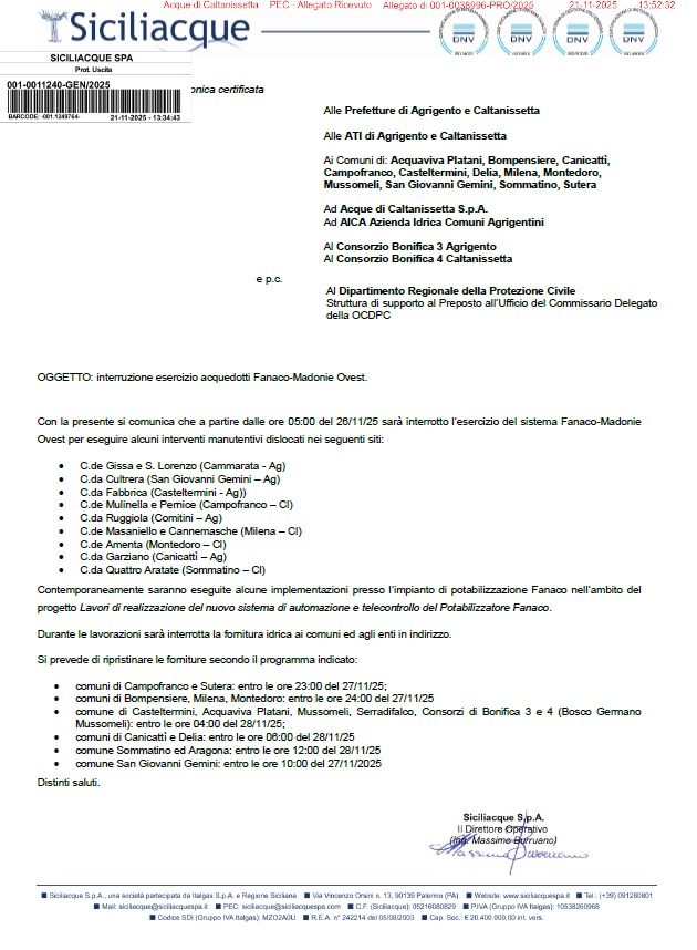 Siciliacque comunica che a partire dalle ore 05:00 del 26/11/25 sarà interrotto l’esercizio del sistema Fanaco-Madonie Ovest per eseguire alcuni interventi manutentivi, con conseguente interruzione della distribuzione nei comuni di Acquaviva Platani, Bompensiere, Campofranco, Delia, Milena, Montedoro, Mussomeli, Sommatino, Sutera.