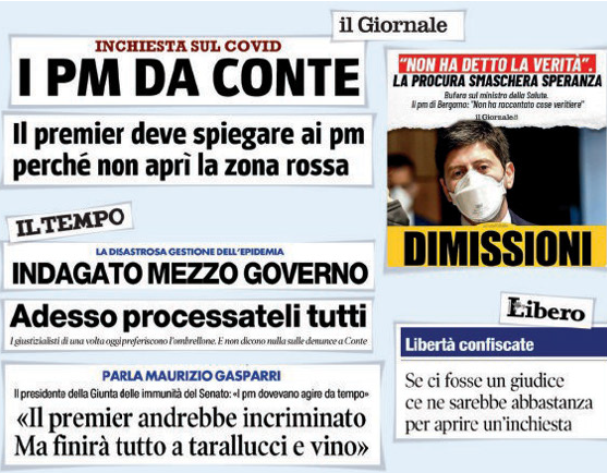 E Meloni, con un in, chiede un passo indietro a Speranza (“Dimissioni”), citando il titolo di un articolo del G iornale: “La Procura smaschera Speranza”. Sul velluto Il Tempo, riportando la notizia dell’indagine su Conte e alcuni ministri: “Adesso processateli tutti”.