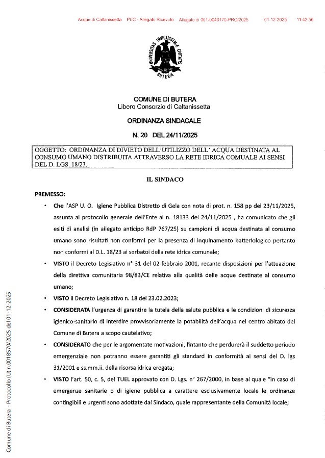 Caltanissetta 401 > News > Crisi idrica > Comune di Butera: Ordinanza di divieto dell’utilizzo dell’acqua destinata al consumo umano distribuita