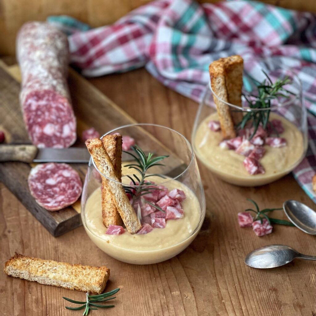 Una deliziosa crema vellutata arricchita con crostini al rosmarino e da saporiti cubetti di Salame Felino IGP, un prodotto d’eccellenza del nostro Paese.